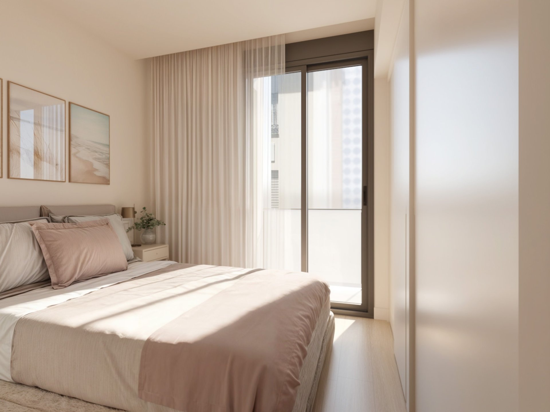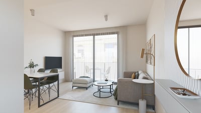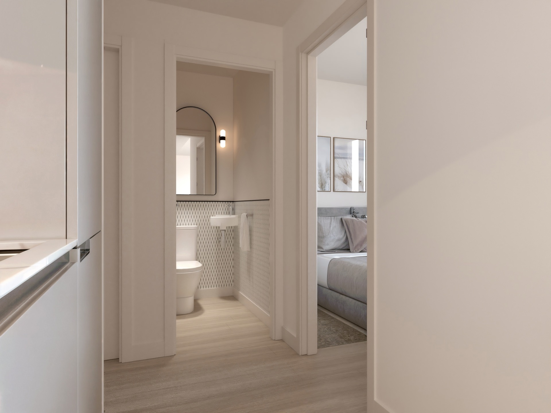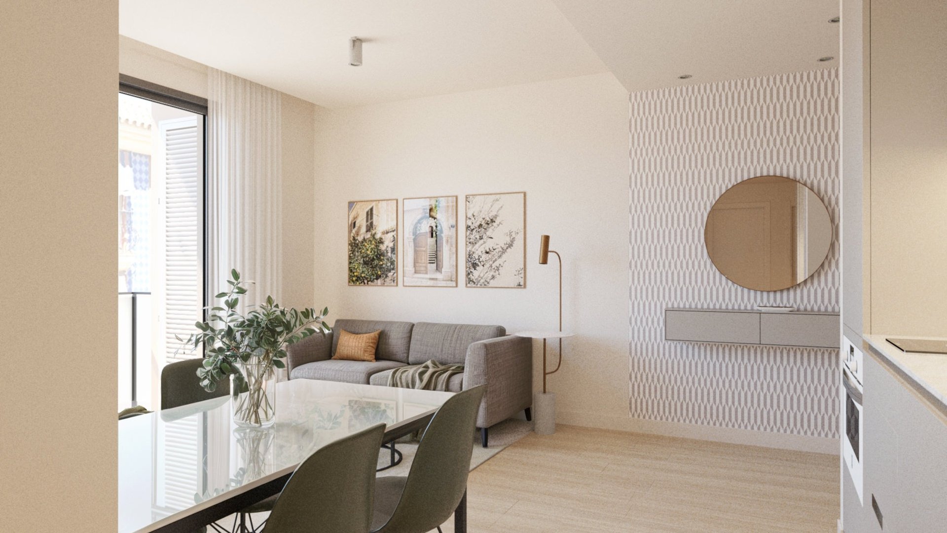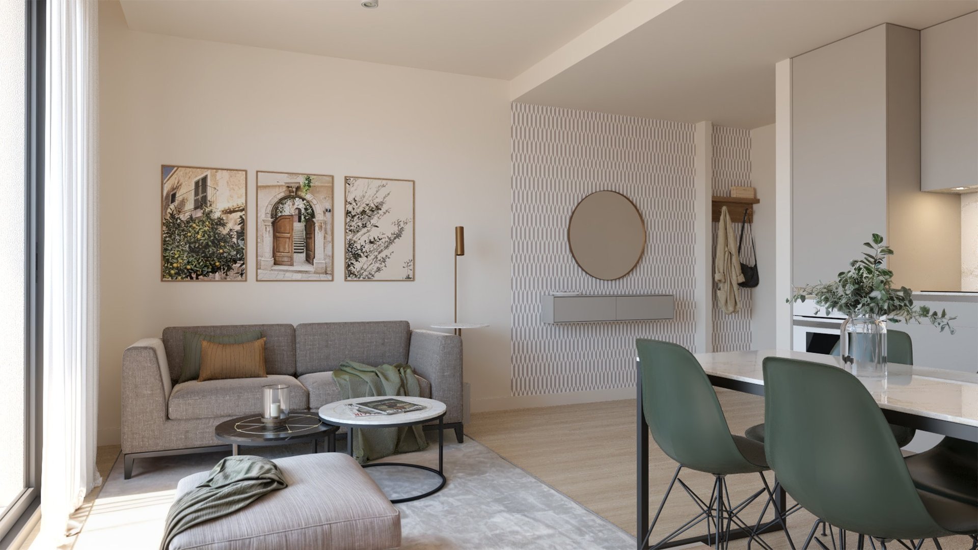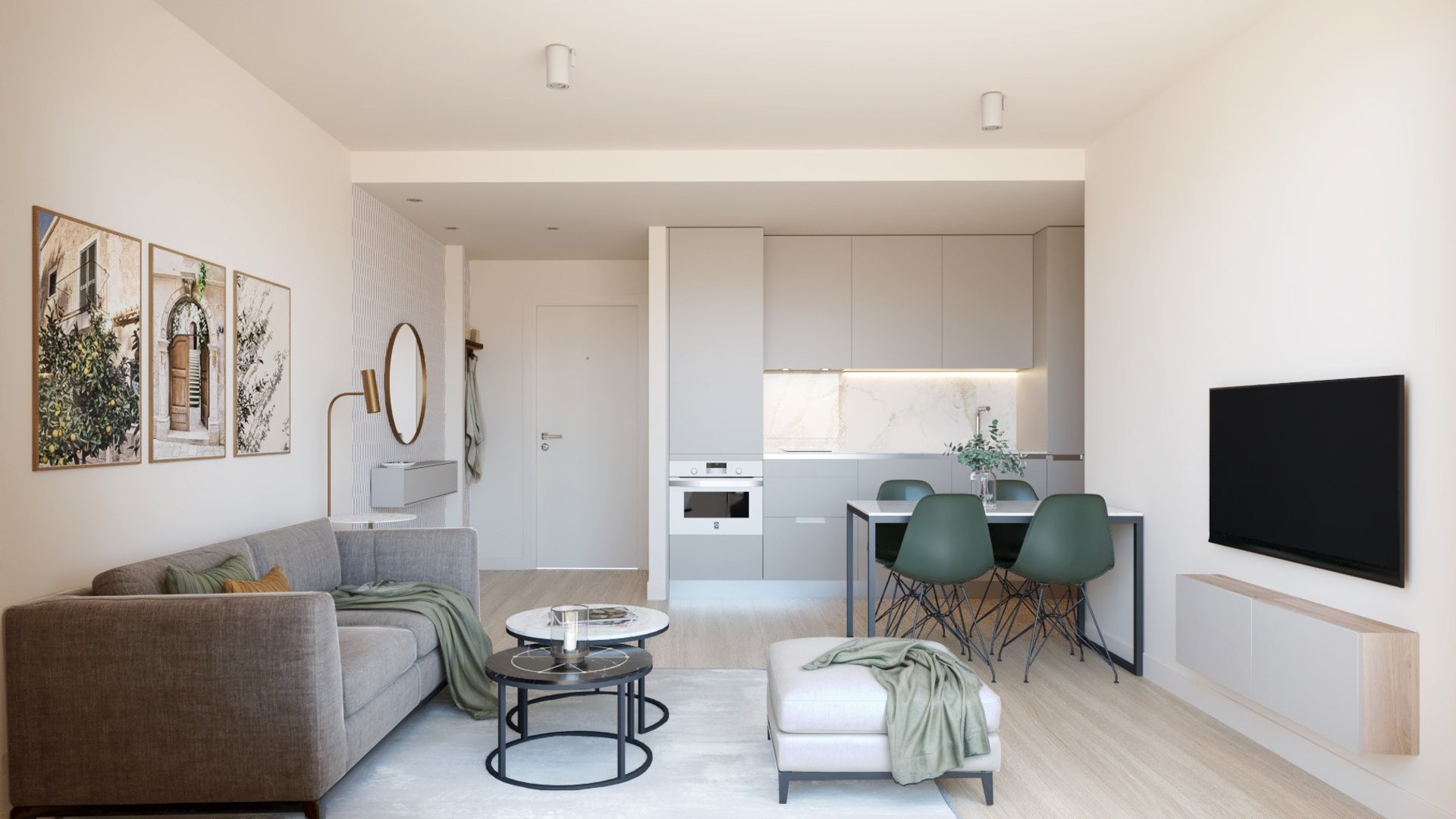 Los apartamentos van desde los 59m2 a los 76m2 . El reto por lo tanto era ofrecer soluciones de aprovechamiento del espacio. Luminosidad, sensación de espacio, cocina integrada en salón.