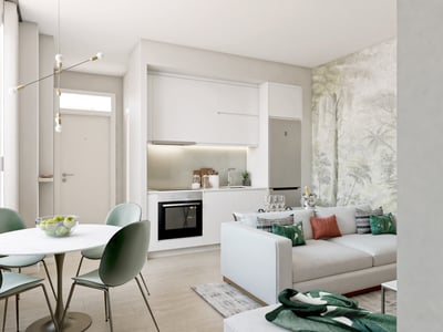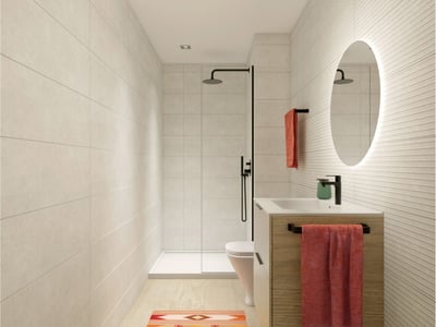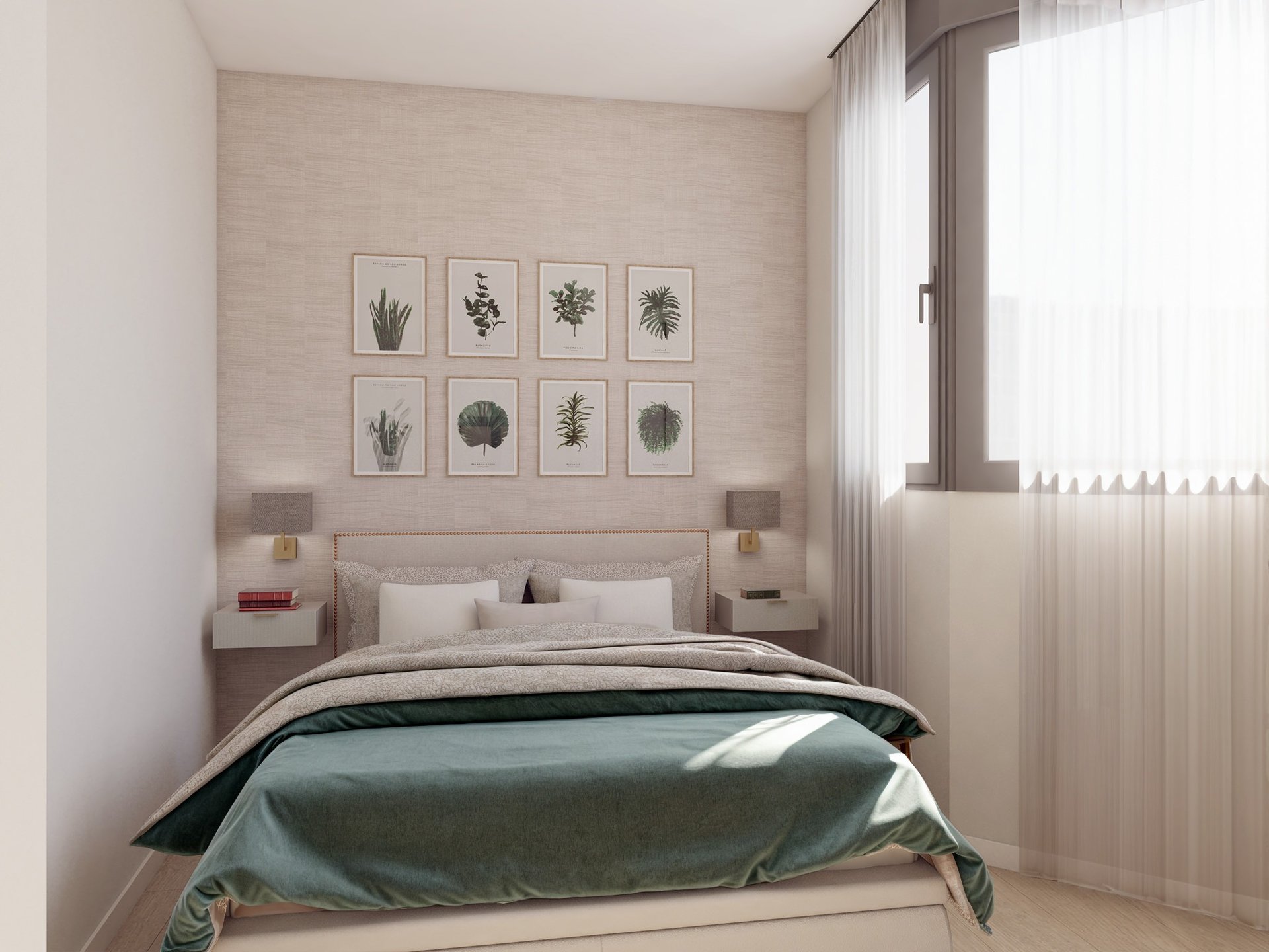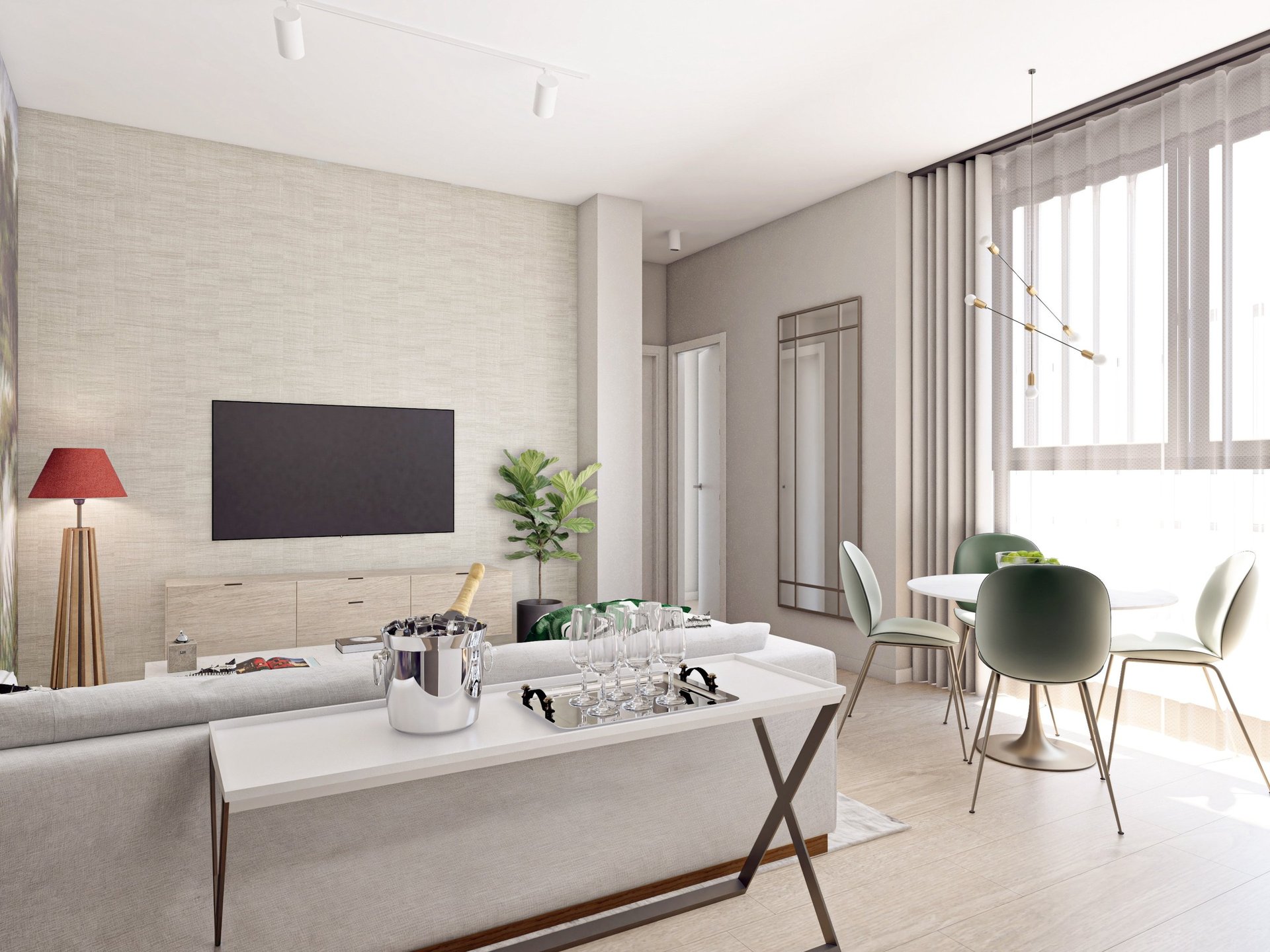 Los apartamentos van desde los 59m2 a los 76m2 . El reto por lo tanto era ofrecer soluciones de aprovechamiento del espacio. Luminosidad, sensación de espacio, cocina integrada en salón.