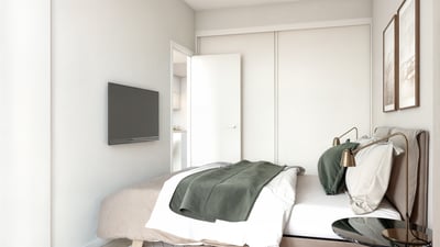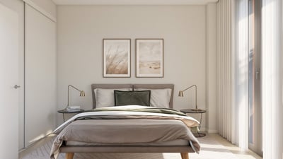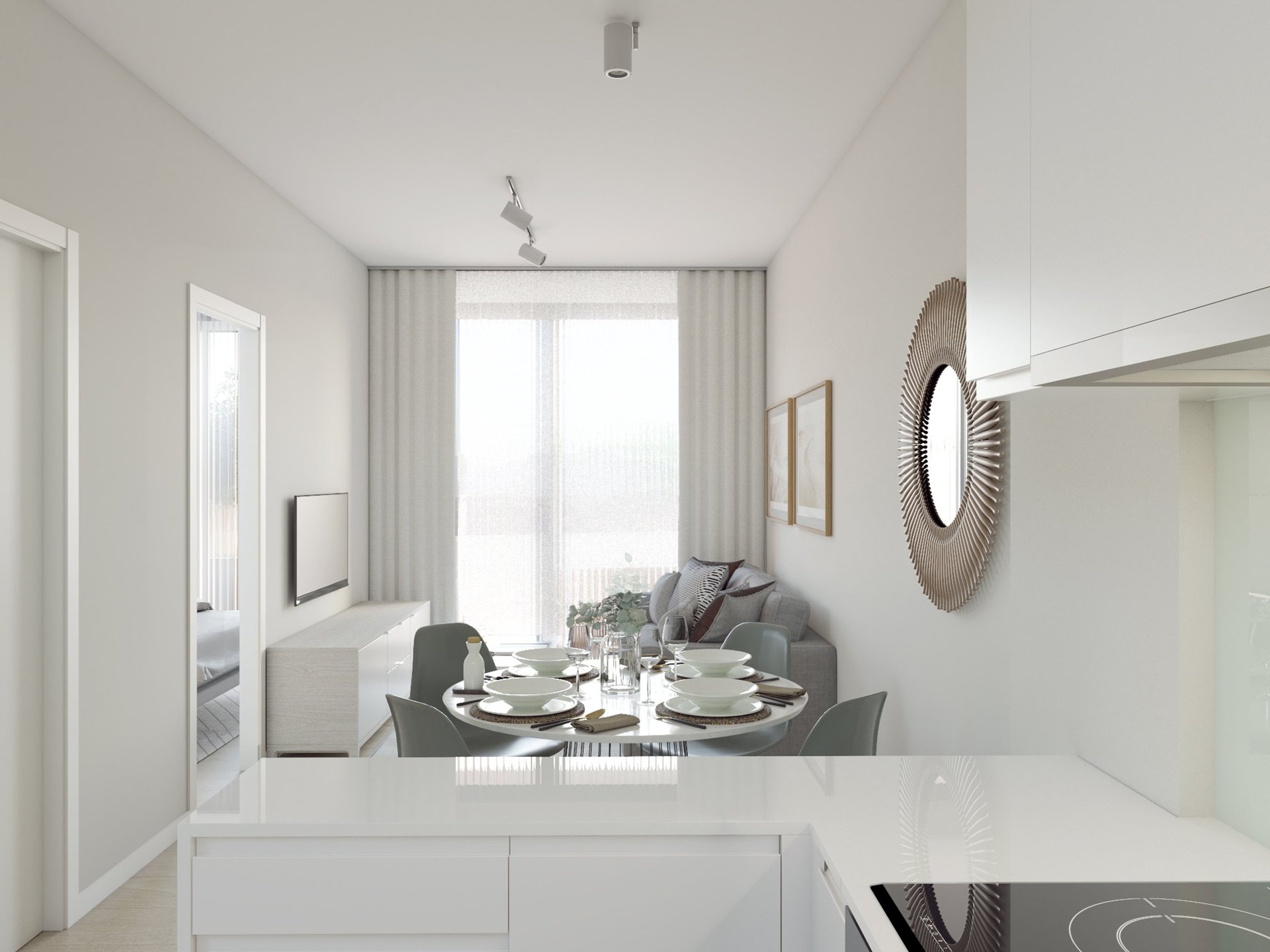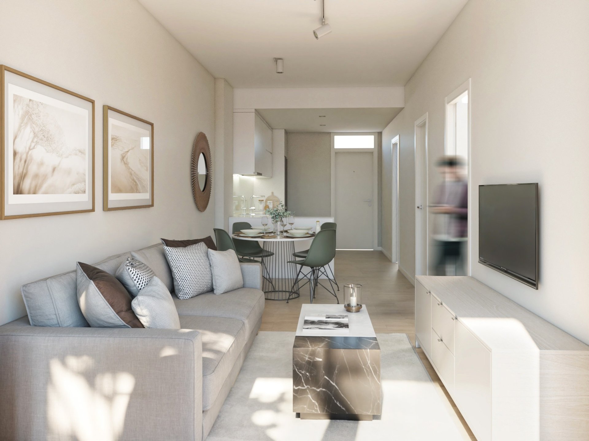 Los apartamentos van desde los 59m2 a los 76m2 . El reto por lo tanto era ofrecer soluciones de aprovechamiento del espacio. Luminosidad, sensación de espacio, cocina integrada en salón.